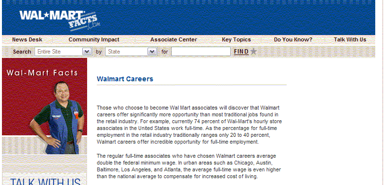 Wal-Mart used to list as a fact the figure that, at one recent point, 74% of WM hourly associates worked full time. All of a sudden, this number has disappeared from several places on the "Do You Know" section of walmartfacts.com. However, "currently 74 percent of Wal-Mart�s hourly store associates in the United States work full-time" still appears on the careers section. (UPDATE: The page has been modified, and now reads " the majority of Wal-Mart�s hourly store associates in the United States work full-time"; below is a screenshot I took this morning when I initially posted, just in case WM changed its information).